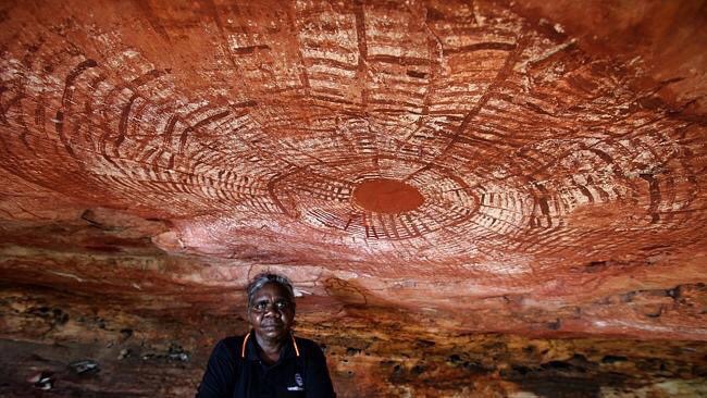 WOW! This is one of the oldest mandala like images in the world, possibly created around 50 000 years ago with the Kimberly Foundation Australia dating project still testing to confirm dates … it is painted in ochre on the ceiling at Cyclone Cave, in the Kimberley, Australia. Robyn Mungulu, senior guide stands here and shares the sacred site.