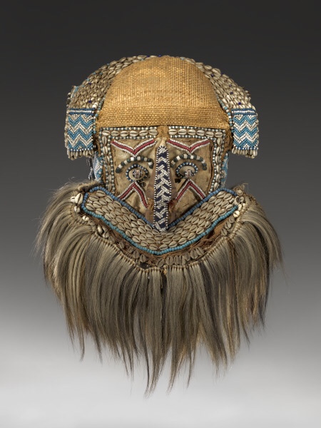 Moshambwooy Mask, 19th–20th century, Kuba culture (Democratic Republic of Congo), Raffia cloth, glass beads, cowries, fur, wood, hide, 17 in. high.