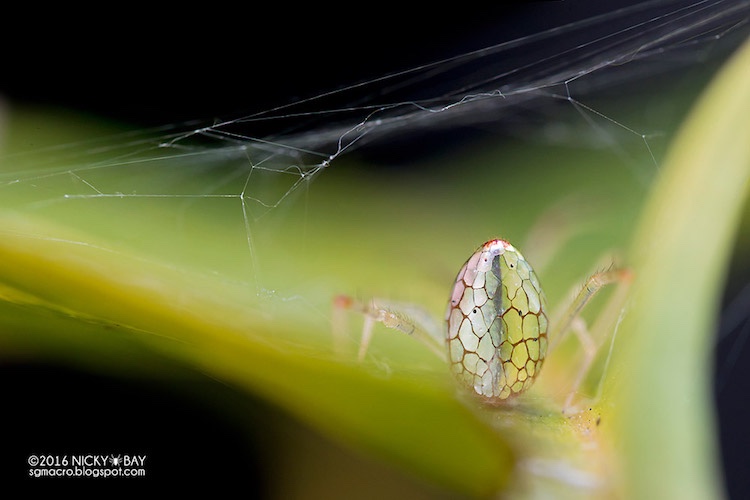For the past several years, Nicky Bay has carefully observed the dazzlingly odd-looking arthropod known as the “mirror spider” (scientifically: “Thwaitesia argentiopunctata”). The Singapore-based photographer has concentrated his macro lens on this small creature whose midsection is cloaked in silvery, mosaic-like panels that reflect light. From certain angles, it looks like it’s wearing fabulous, tiny sequins.