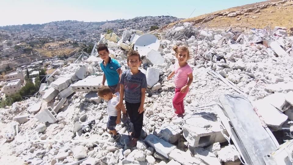 Palestinian children on the rubble of their home which was destroyed today by Zionist occupation forces. The house is owned by Yasin Zaatrah from Jabal Amukaber in occupied Jerusalem, occupied Palestine, 1 July 2020.