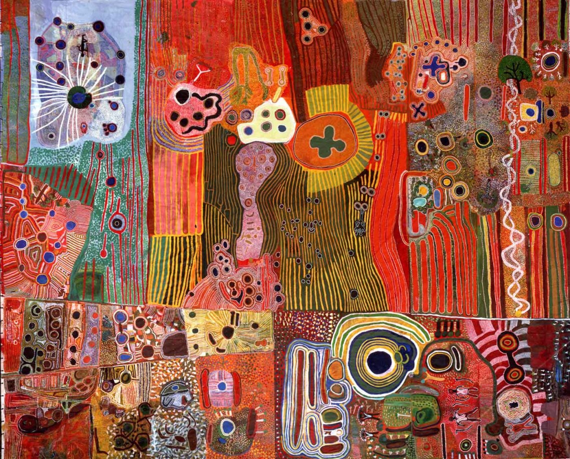 The painting is the result of the collaboration of over sixty artists from the South Kimberley region. They met at Pirnini, an area to the south west of Fitzroy Crossing, on the northern edge of the Great Sandy Desert to create this work. It was the second attempt to make such a canvas. In 1996 a canvas was produced but the artists were unhappy with it. Artists had worked independently on different parts of the painting, with different notions of scale and so the panels did not fit together the way that they should have. Learning from this experience, a larger canvas was used and there was also a better understanding of how the different elements of the painting should work together. The result is breathtaking in its scope. It captured the extremely strong affiliation to land that people had to the land they had lived off the land until the 1960s.