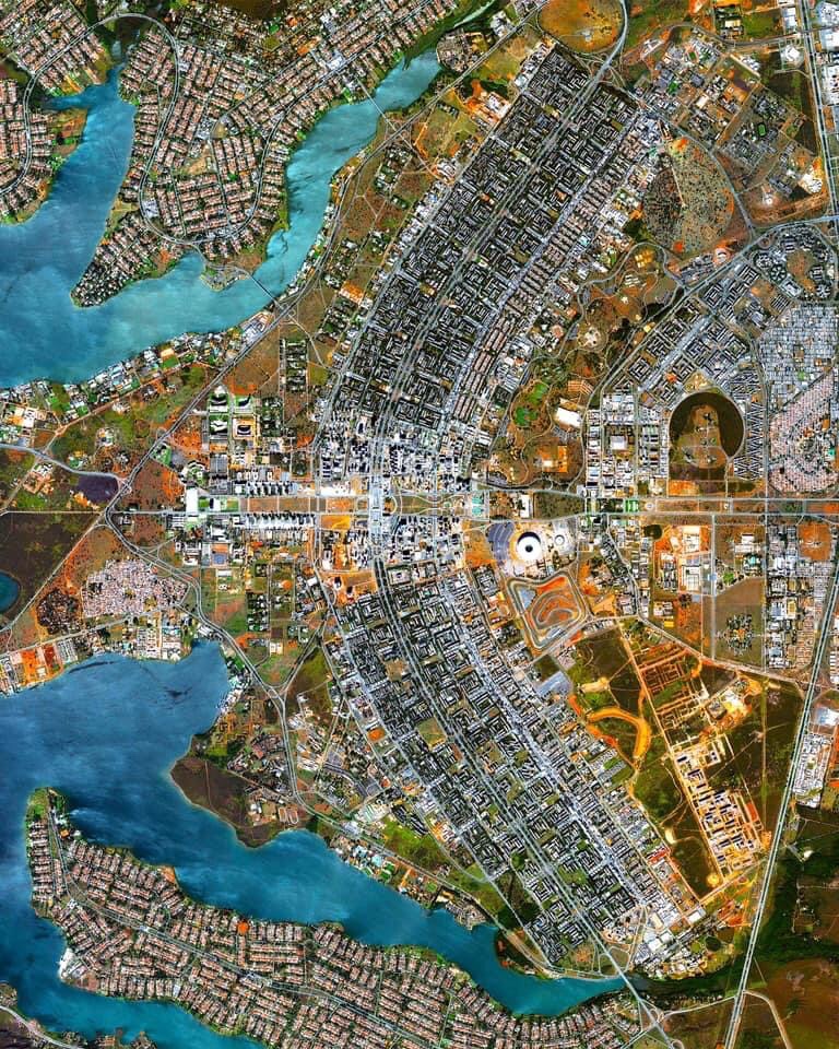 This Overview captures the urban plan of Brasilia, Brazil. The city was founded on April 21, 1960, in order to move the capital from Rio de Janeiro to a more central location within Brazil. The design — resembling an airplane from above — was developed by Lúcio Costa and prominently features the modernist buildings of the celebrated architect Oscar Niemeyer at its center.